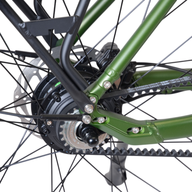 Strak vormgegeven e-bike met intube accu, riemaandrijving en stille achterwielmotor.